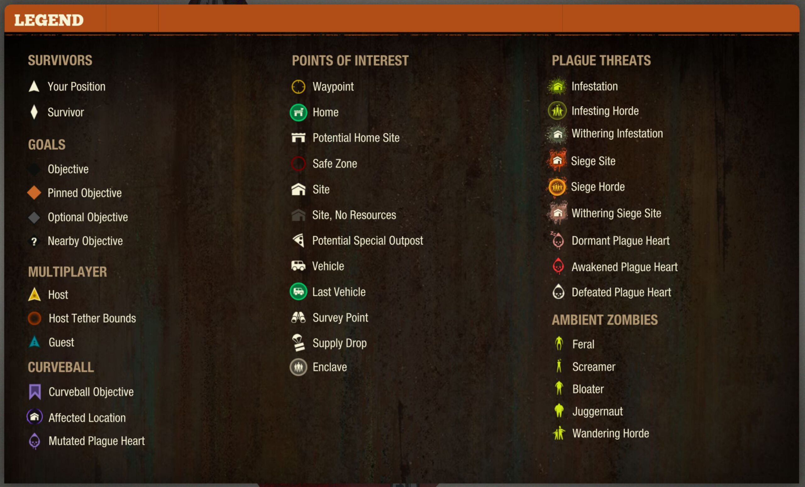 There are many icons on your map and it can get confusing if you don’t know what they all mean. Hovering over them will give you a good description, or use the handy legend for all the icons. When in the map screen hit “L” on Keyboard or “Y” on controller to view it.