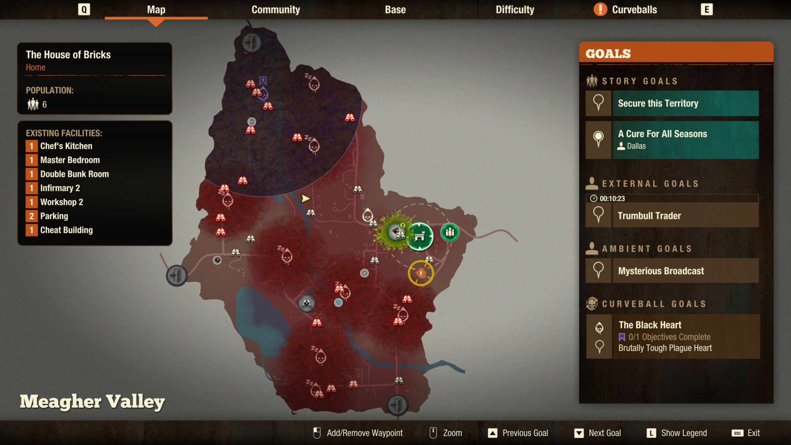 Changing maps brings you to a new town full of buildings to be scavenged and Plague Hearts to be destroyed. You will start at the base of your choice, at which point you’ll have access to all the resources and gear that you had in your previous base (including all the materials and influence you spent on upgrading facilities). This also automatically relocates any parked car that you had in a parking spot at your old base, even if your new base has fewer parking spots!
