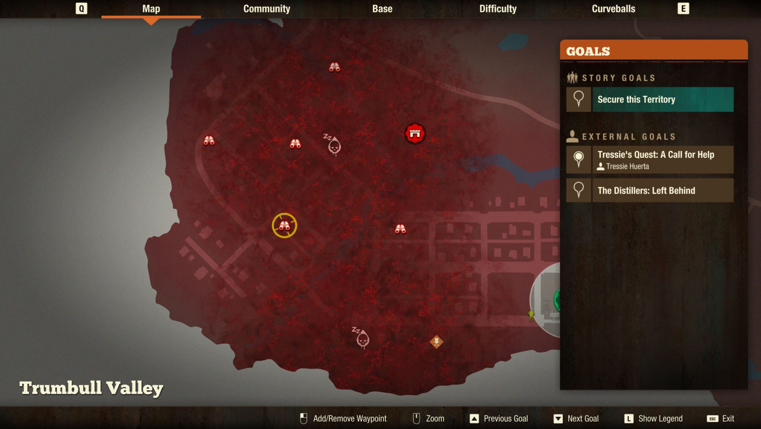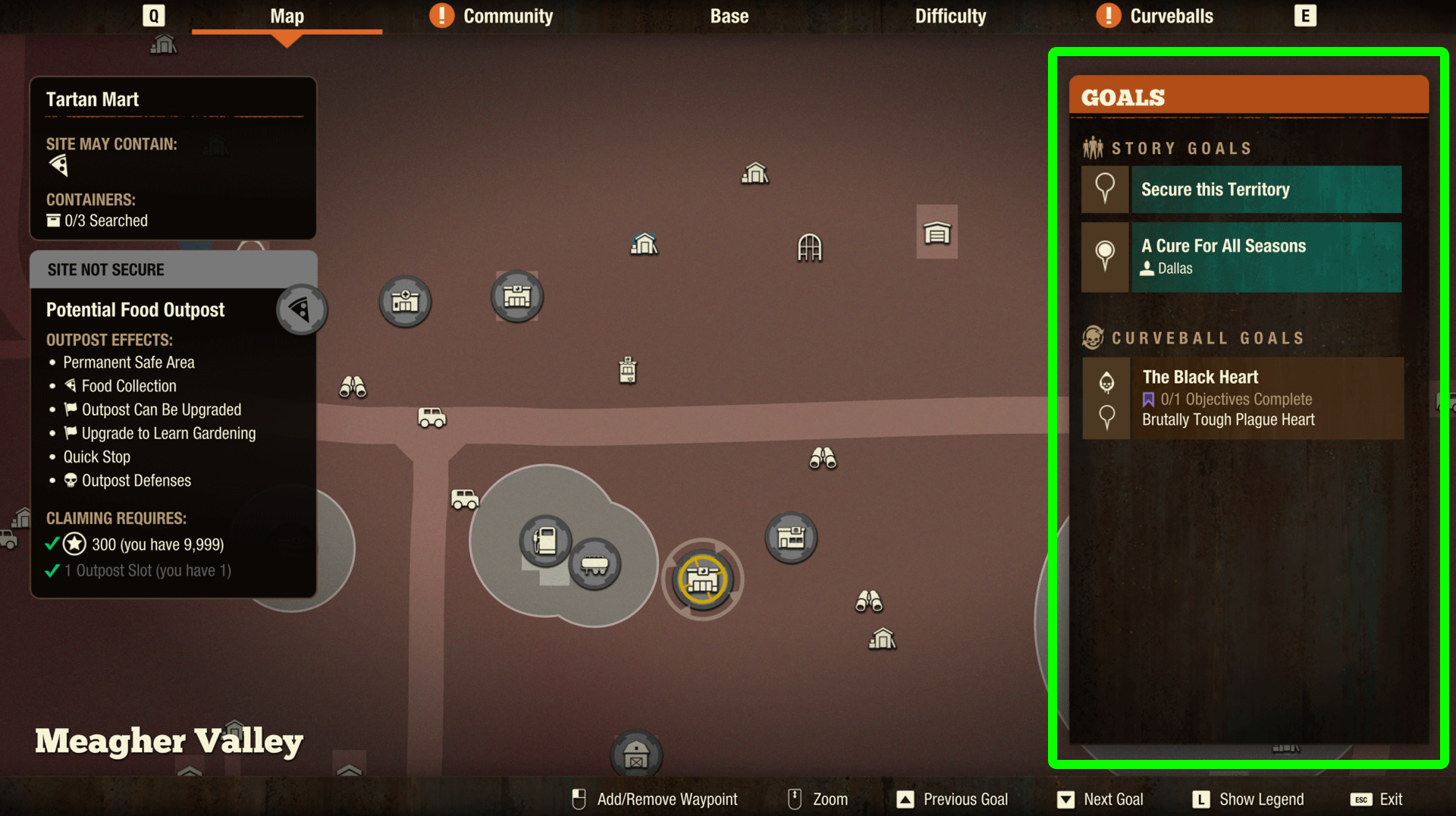 The Map screen provides an overview of your town, marks plague territories, identifies locations you’ve surveyed, and shows which sites have been thoroughly scavenged. It also shows you the list of your current goals.